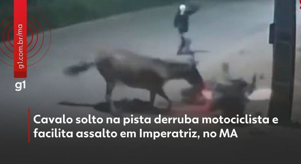 Um motociclista viveu momentos de tensão na madrugada de segunda-feira (26) após ser atingido por um cavalo solto na Avenida Manoel Ribeiro, em Imperatriz, no interior do Maranhão. Logo após cair da moto, ele foi cercado e assaltado por três homens que agiam no local. Imagens de uma câmera de segurança registraram a cena. O vídeo mostra o animal atravessando a pista em disparada e indo em direção ao motociclista, que acaba sendo derrubado. Em seguida, o cavalo foge da área. Aproveitando a situação, três criminosos se aproximam da vítima, roubam a motocicleta e levam objetos pessoais, entre eles celular e carteira.